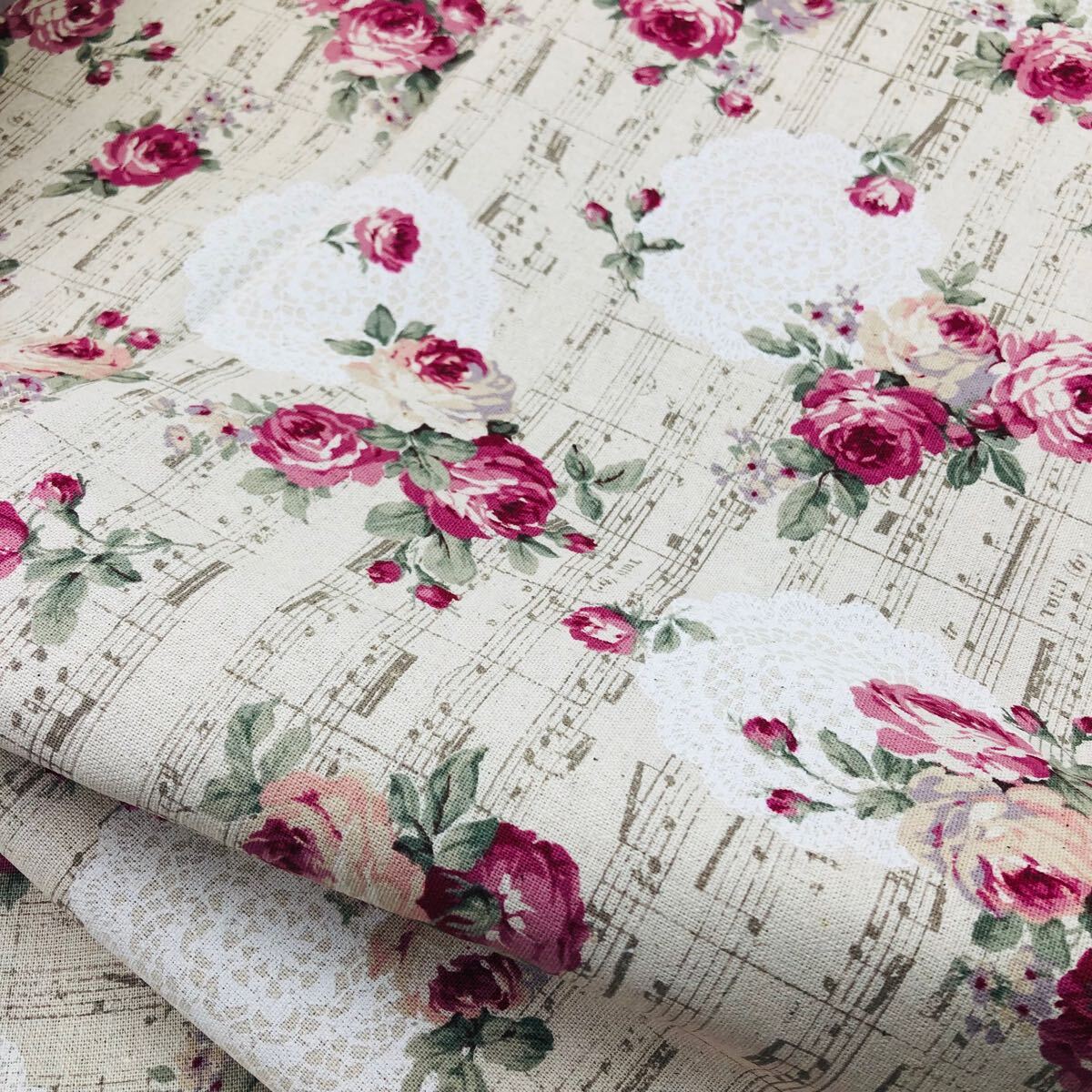 - 1m 綿麻キャンバス ローズ柄 生成り110×100 ドイリーレース コットンリネンキャンバス 音符 生地 ハギレ 薔薇