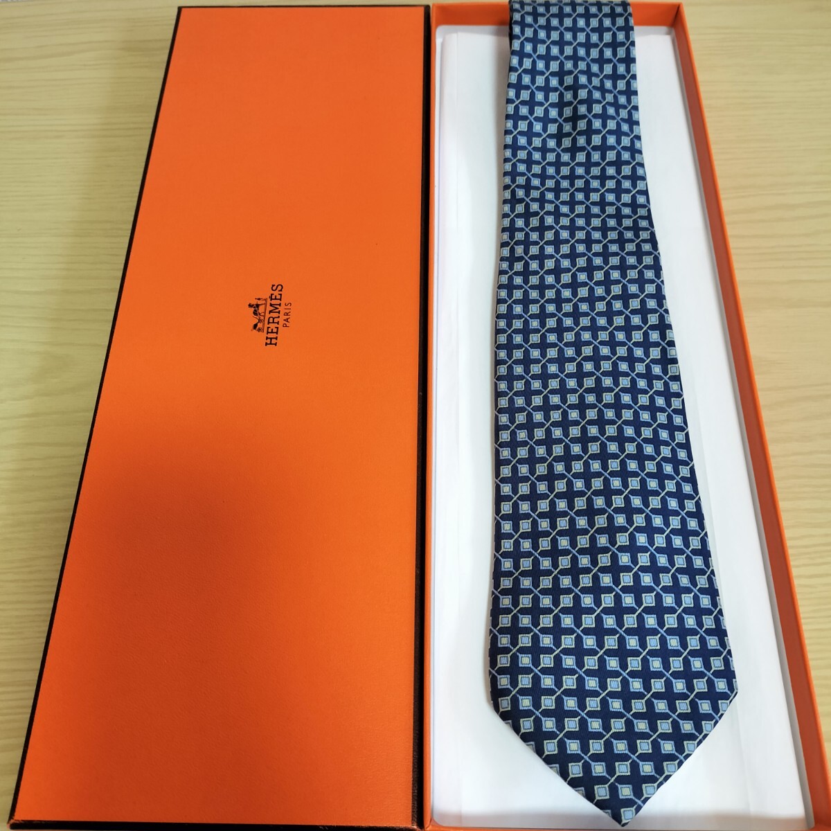 - エルメス(HERMES)紺ミクロスクエア格子柄模様のネクタイ