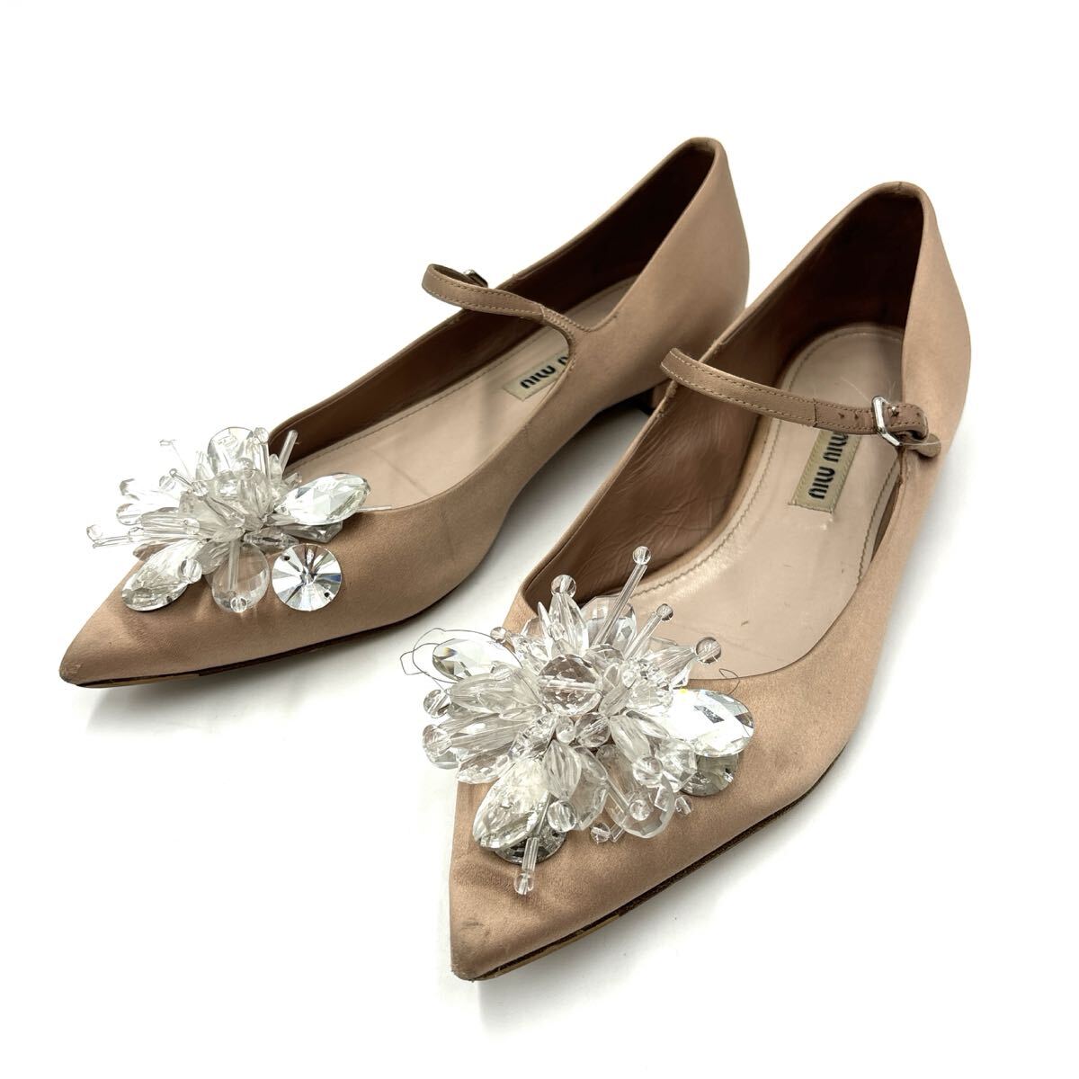 > H * イタリア製 '高級感溢れる' miu miu ミュウミュウ 豪華ビジュー装飾 メリージェーン / フラット パンプス EU37 23.5cm レディース