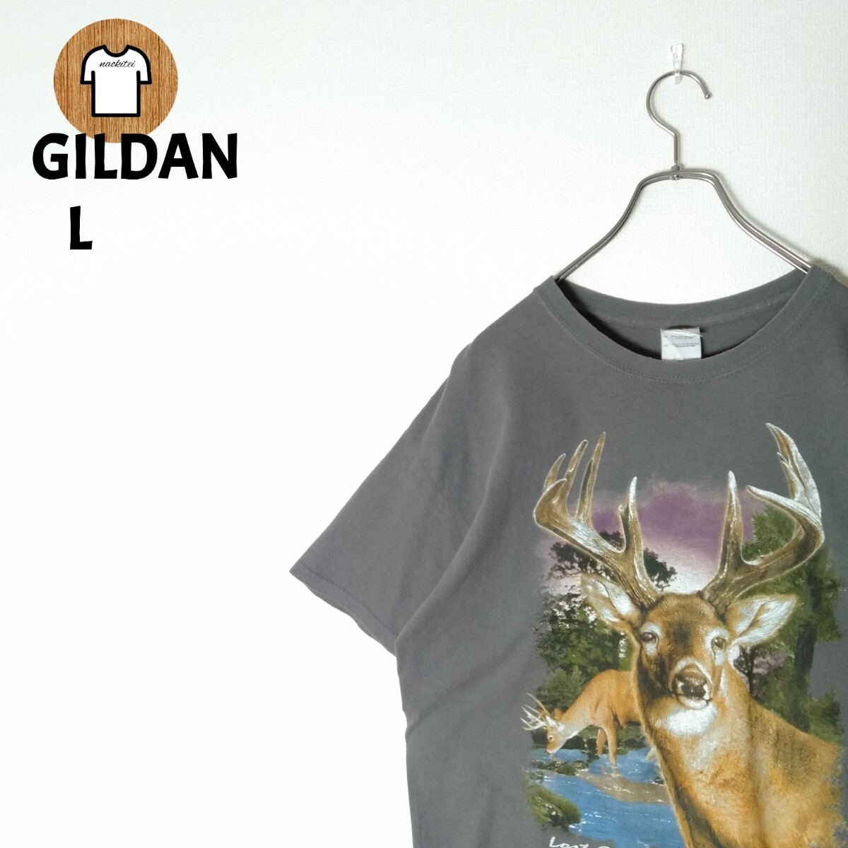 > GILDAN 半袖 Tシャツ tシャツ L グレー B86 コットン 綿 ギルダン トナカイ 動物 森 ビッグプリント デカプリント ショートスリーブ