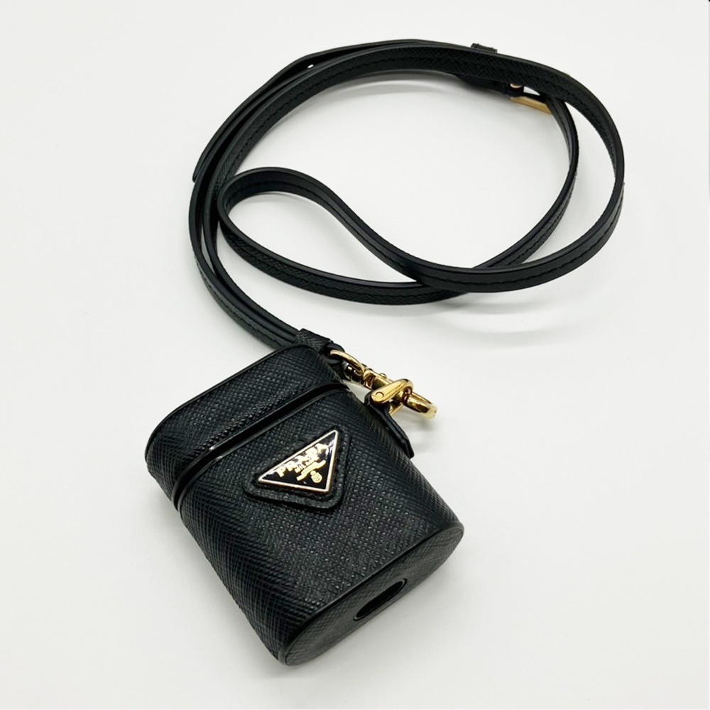 > プラダ ストラップ付エアポッツケース 1ZD002 サフィアーノ ユニセックス レザー トライアングルロゴ ブラック ABランク 中古
