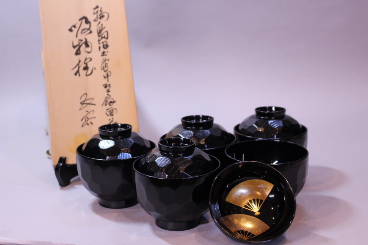 - q-6682 未使用!輪島塗 大極上本堅地 扇面蒔絵吸物椀5客 共箱