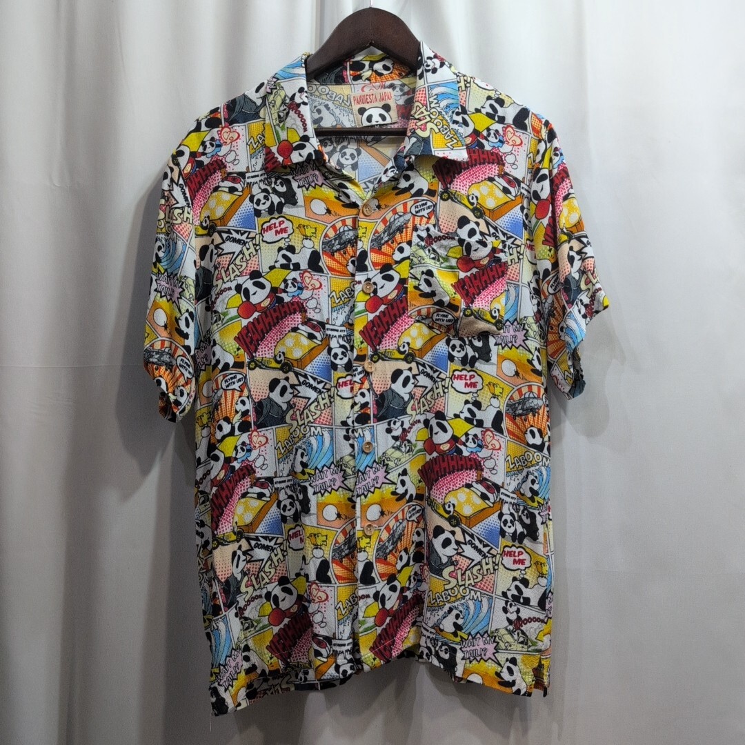 - 美品 PANDIESTA JAPAN パンディエスタ アメコミ風 総柄 ちりめん レーヨン 半袖 アロハシャツ M メンズ 半袖シャツ/東洋/キューン/児島