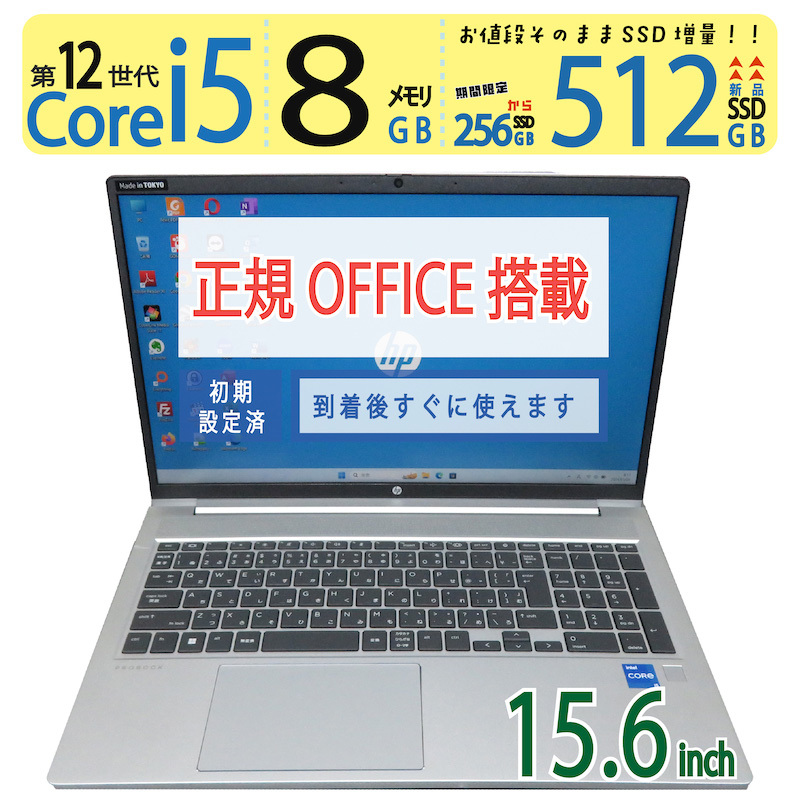 > 【高速12世代CPU・512GB】◆HP ProBook 450 G9 / 15.6型 ◆ Core i5-1235U[12スレッド] /新SSD 512GB / メモリ8GB ◆ win11 / Office