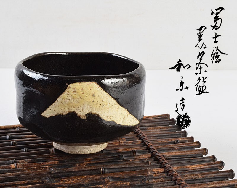 - 茶道具 川崎和楽造 富士絵 黒楽茶碗 共箱 CWSH
