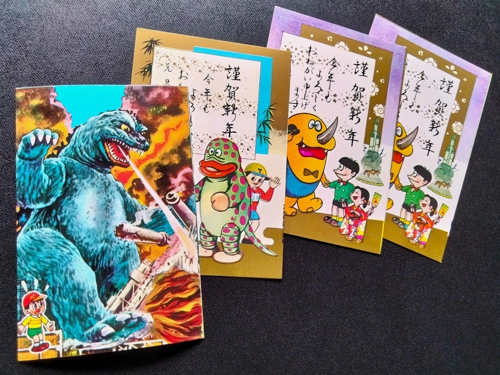 - パチ怪獣 ゴジラ 古い まんが年賀状 はがき 当時物 未使用 4枚セット !! ☆ テレビの人気者 グズラ 忍者ハットリくん ジッポウ 駄菓子屋 2.