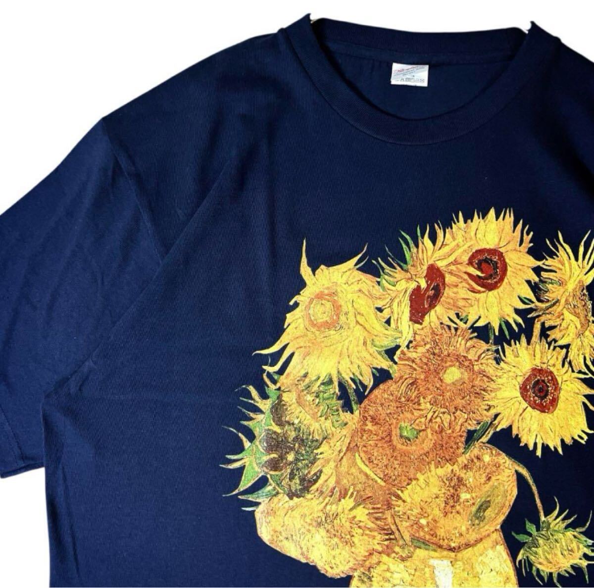 > ゴッホ 名画「ひまわり」アートTシャツ 芸術 絵画 XL 紺ネイビー 新品未使用 Tシャツ グッドデザインプリント 半袖Tシャツ