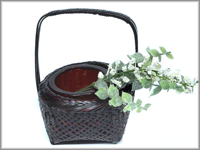 - 茶道具●花入●手付き花入・花籠●竹製●底角型寸胴型●エビ茶漆塗り●小振り
