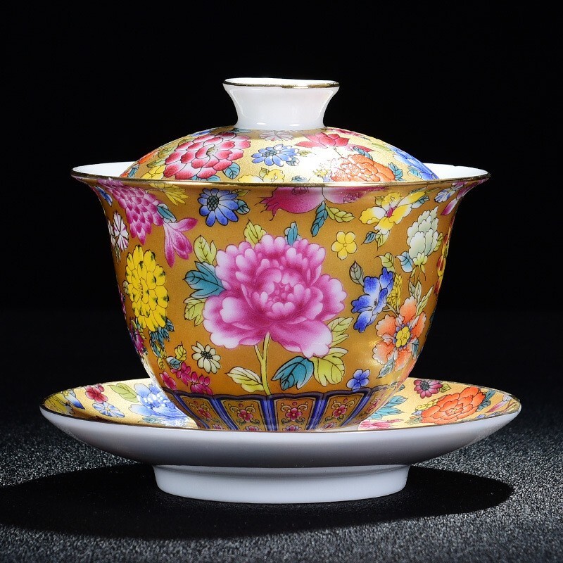 - 蓋碗『百花斉放』(金色)琺瑯彩 中国茶器