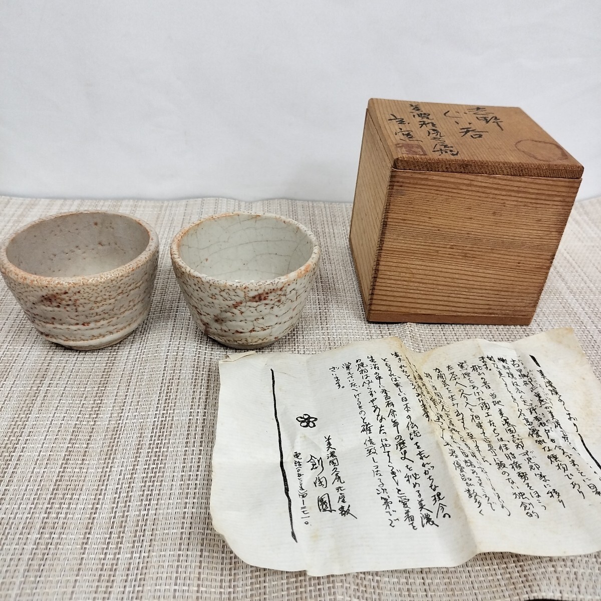 > 【美品】美濃焼 志野 ぐい呑み 2個セット 岐阜 宝窯 創陶園 高さ4.8 口径7 陶器 陶芸 酒器