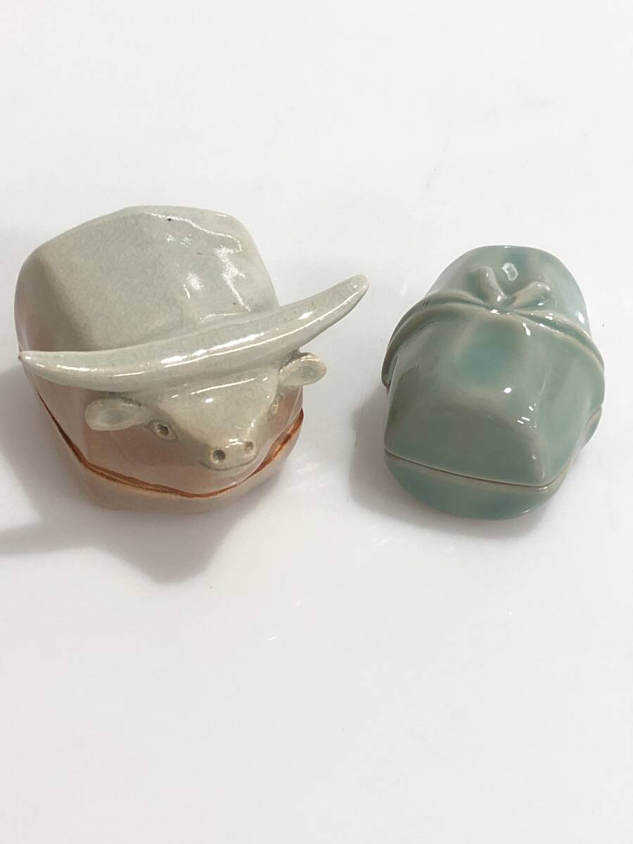 - B4244 茶道具 香合 2点まとめて 在銘 印あり 牛 竹?