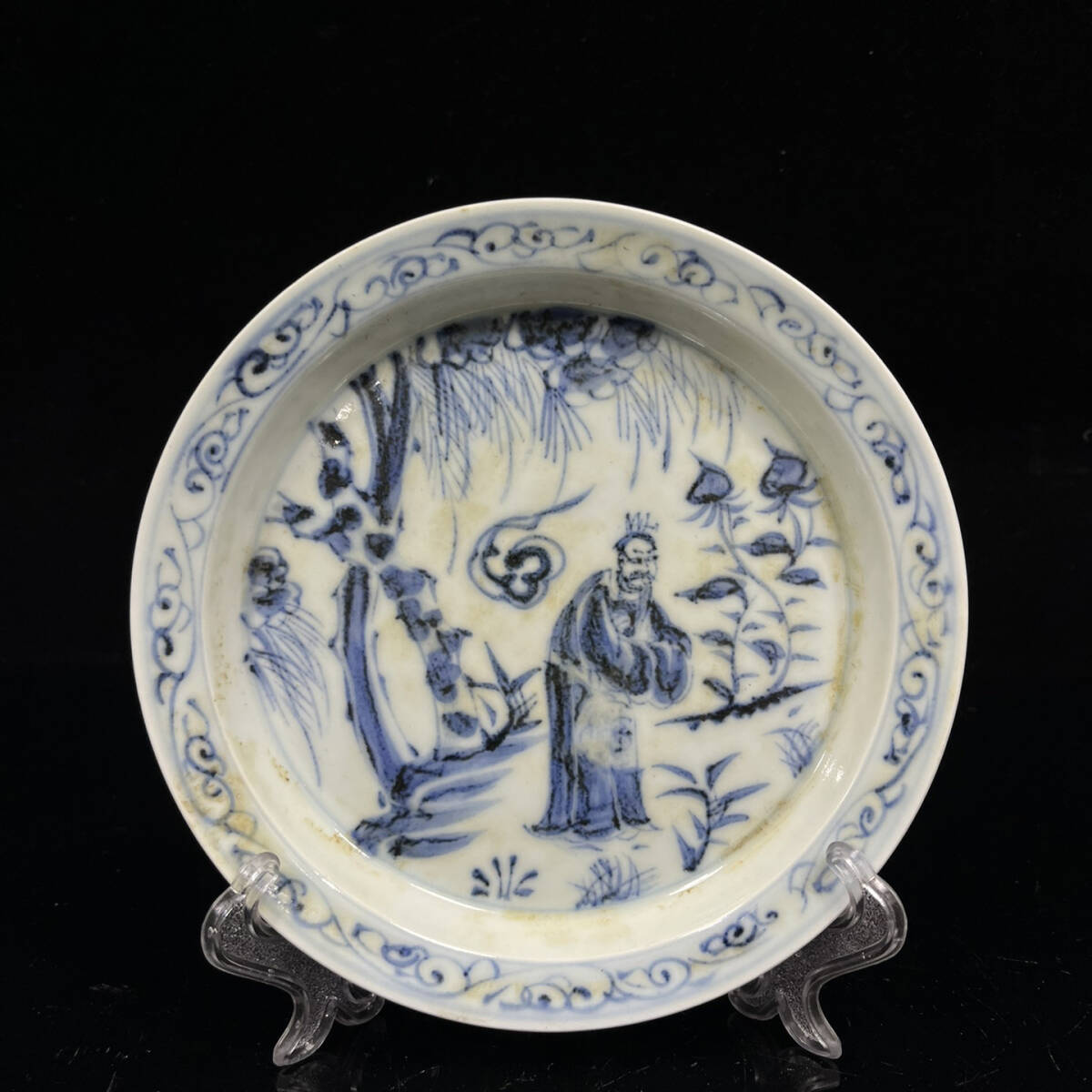 - 7+GV4746「東洋美術」 中国骨董 人間国宝 磁器製品【青と白の人物が描かれた茶盆】 旧物 孤品 珍品 陶磁器 収蔵価値が高い