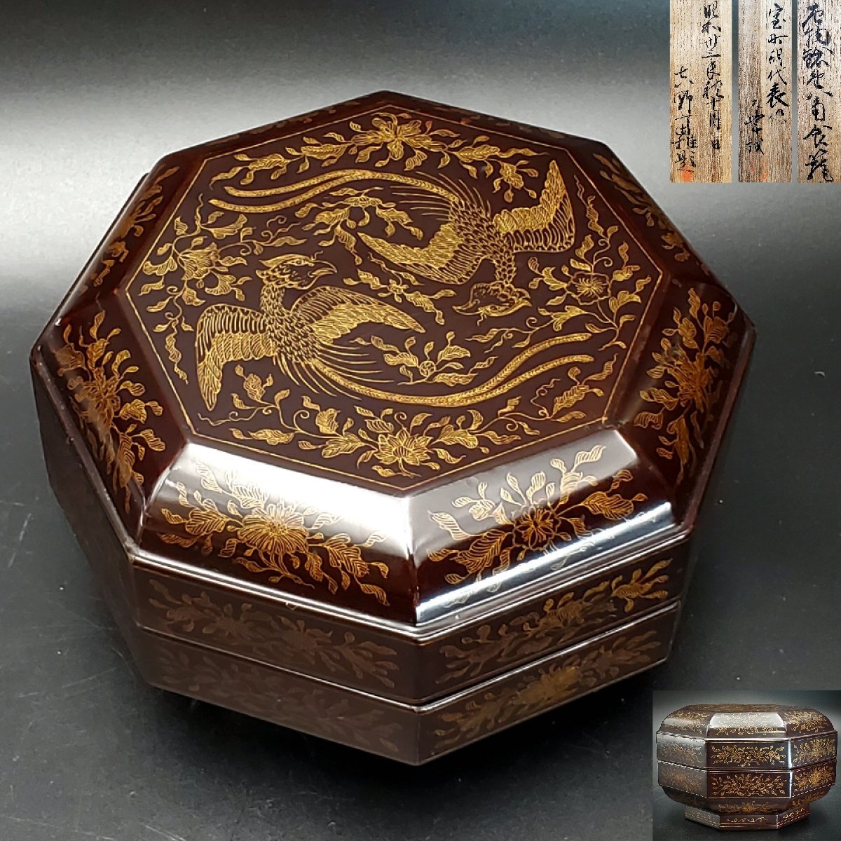 > 【宝蔵】人間国宝/前大峰識 室町期代表作 唐物鎗金八角食籠 喰籠 鳳凰沈金 約15.5㎝ 時代物 漆工研究家/吉野富雄題 共箱