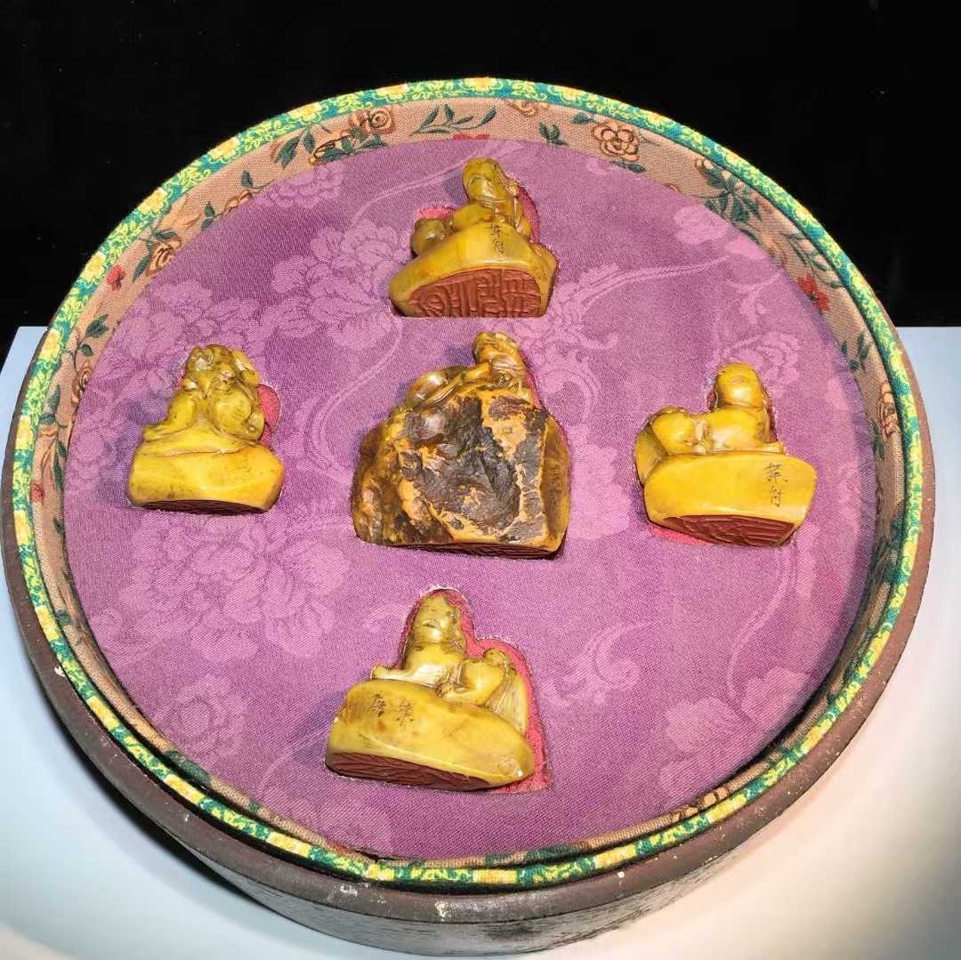 > 秘藏 印章 清代 老玉寿山石田イエローストーン・名家リーフボート・五枚の獣の絆 印鑑 唐物 古玉彫 天然石 稀少珍品 古賞物 古置物 旧蔵7.5