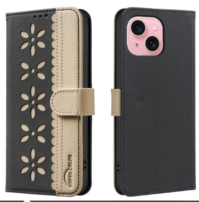 > iPhone13 / iPhone14 フラワー柄 黒×ベージュ 手帳ケース
