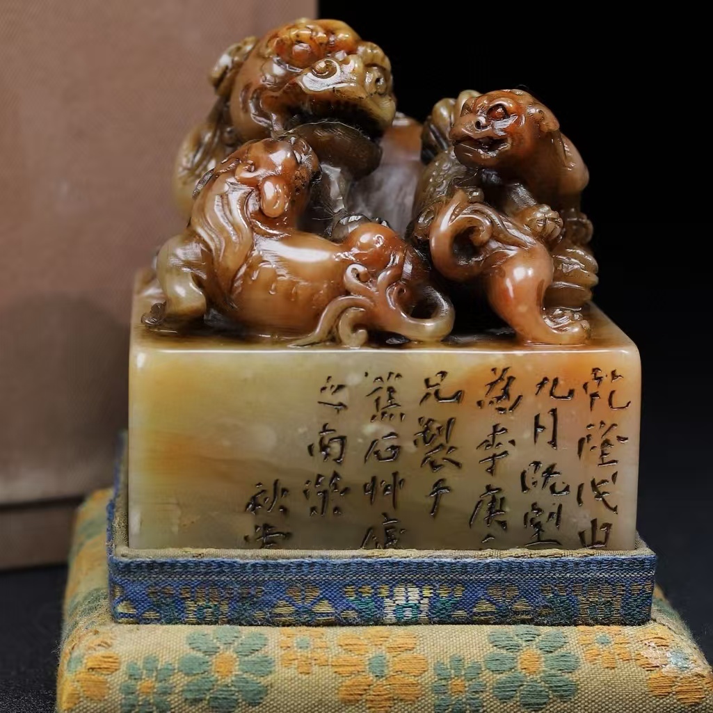 > 印鑒 寿山石 秘藏 清代【 三獅子呈祥・獅子山水印】 印章 古印材 印鑑の方 老玉 唐物 古玉彫 天然石 稀少珍品 古賞物 古置物 旧蔵 7.15