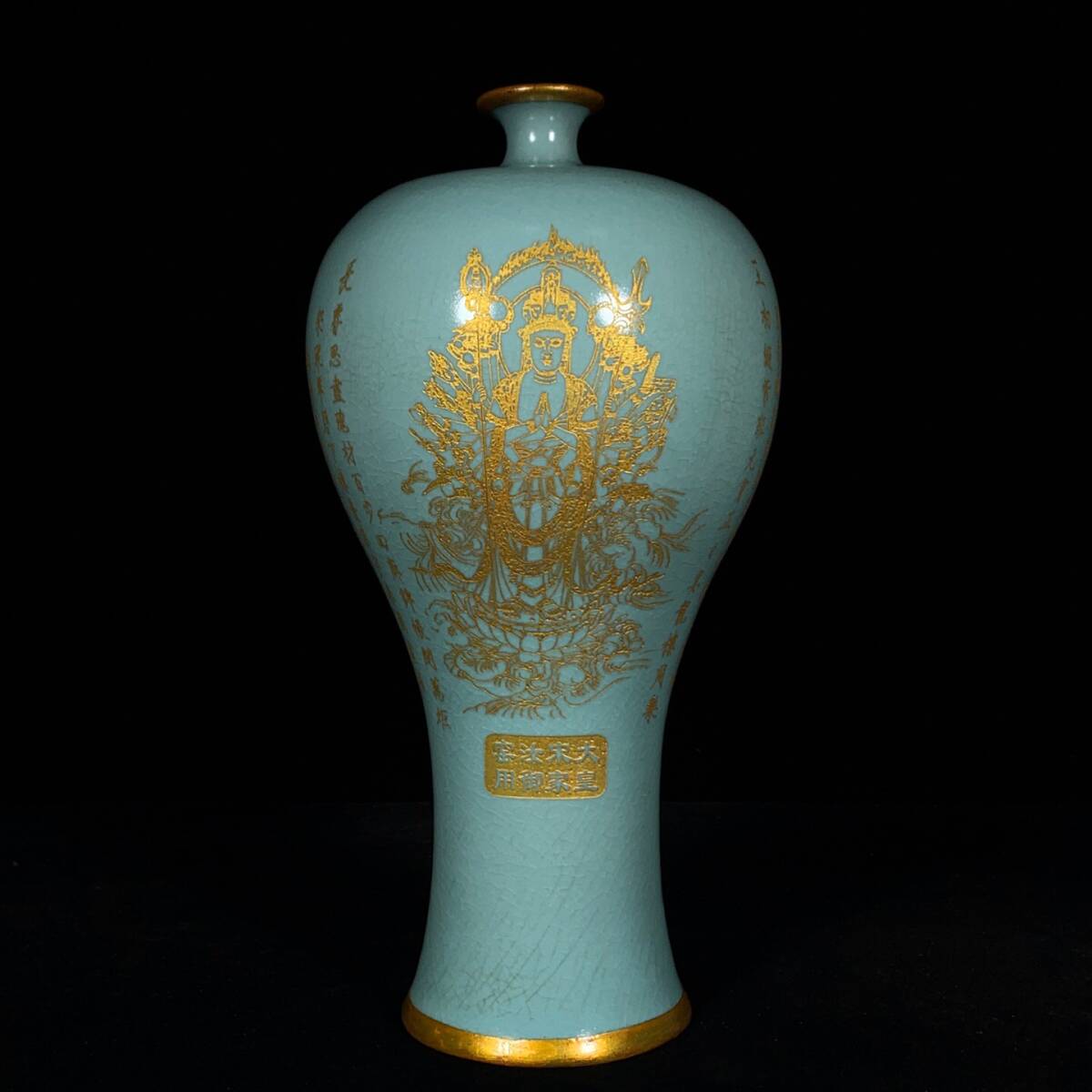 > ▽鴻▽ 宋 古陶瓷品 汝窯 包口 銘文千手觀音紋 梅瓶 陶藝 古賞物 古董品 時代物 稀少珍品 中国古玩 中国古美術