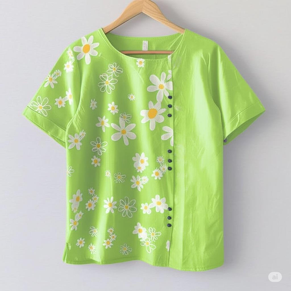 - 新品訳あり 花柄可愛いブラウス 緑 グリーン 半袖 春夏 涼しい ゆったり 丸首 free1942