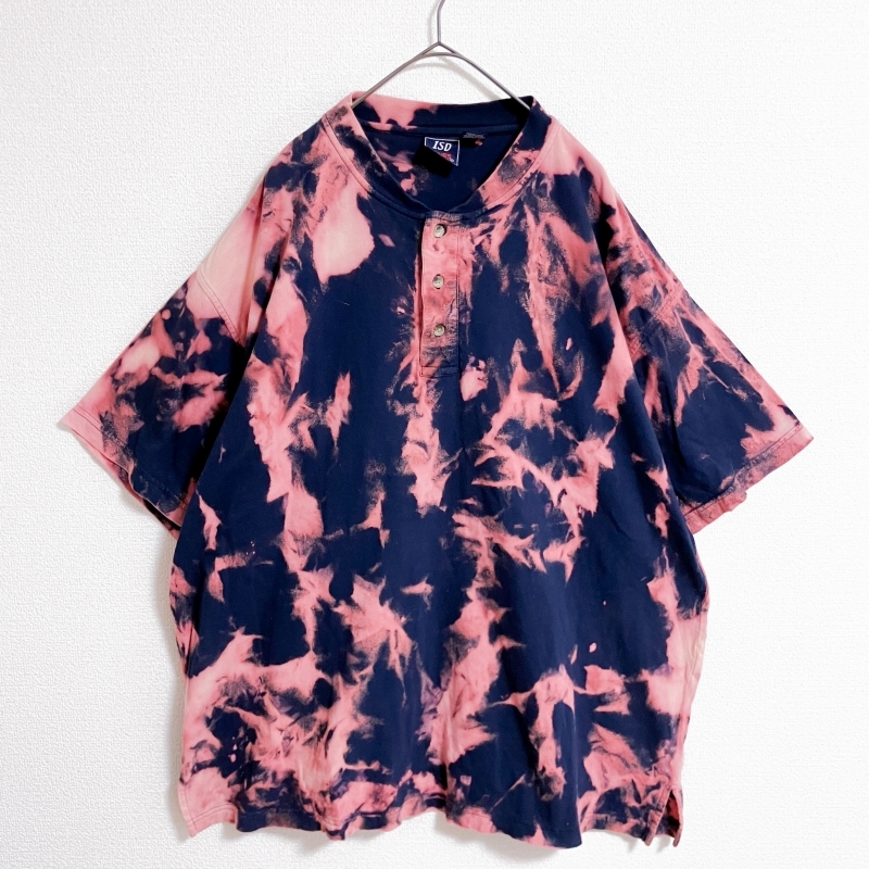 - ISD BLUES タイダイ柄 ヘンリーネック 半袖Tシャツ XL 紺 ピンク