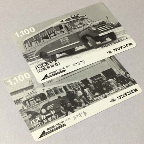 - 〓★〓旧車バスカード【使用済】 『昭和30年頃の乗合バス』+『下関営業所(昭和27年3月改築)』2枚セット/サンデン交通