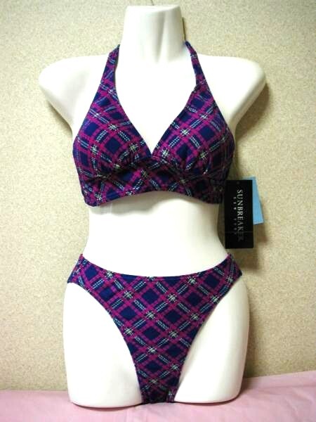 > 『送料無料』 『SUNBREAKER』★激安★スイムウエアー★ホルターネック★露室控えめ★水着 ビキニ★9M★チェック柄★パープルピンク系★
