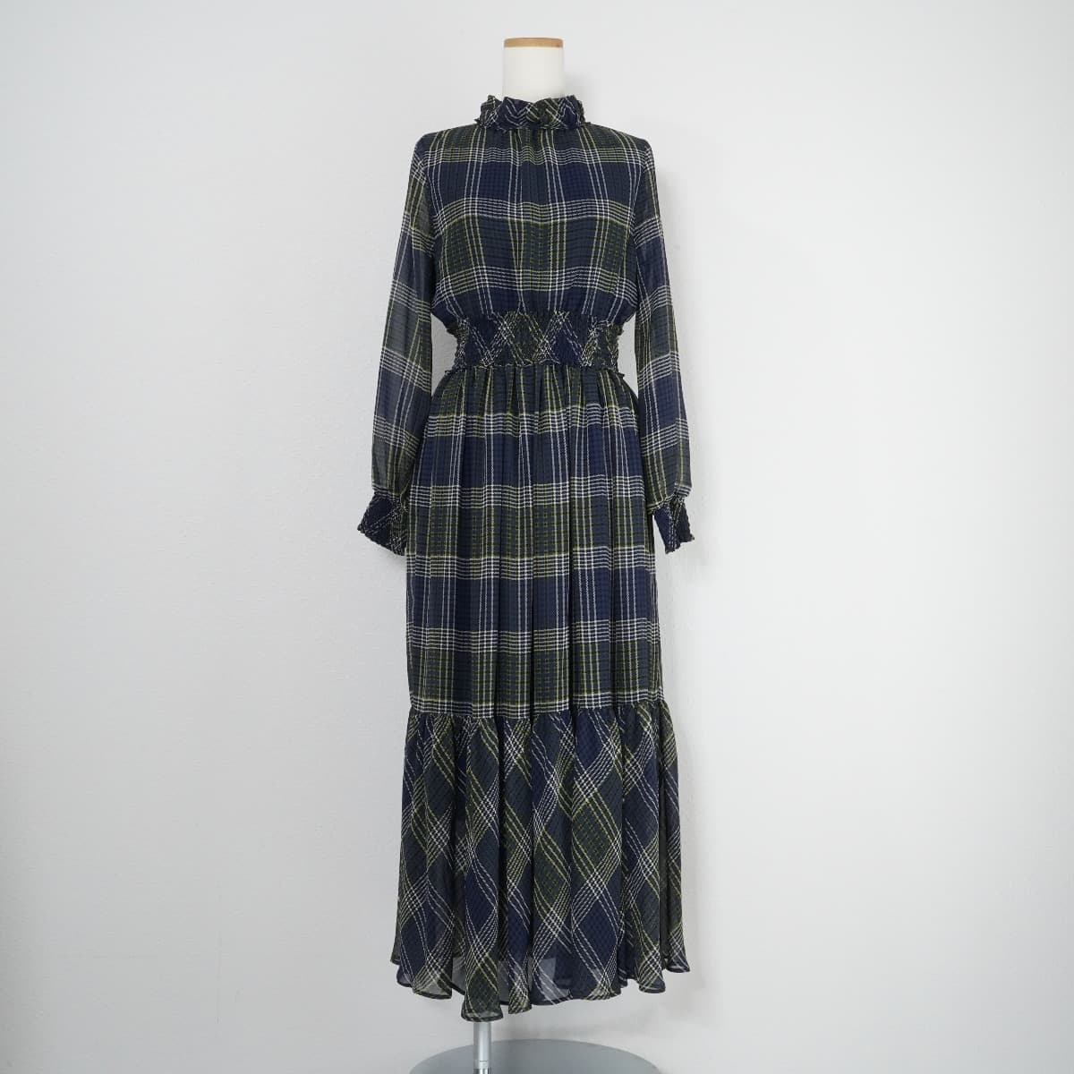 コメント:レトロムード漂うボリュームマキシワンピース。ウエストや袖口にくしゅくしゅっとシャーリングがあり、立体感のあるメリハリなデザインです。合わせるアイテムによりシーンレスで着用できるアイテムです。