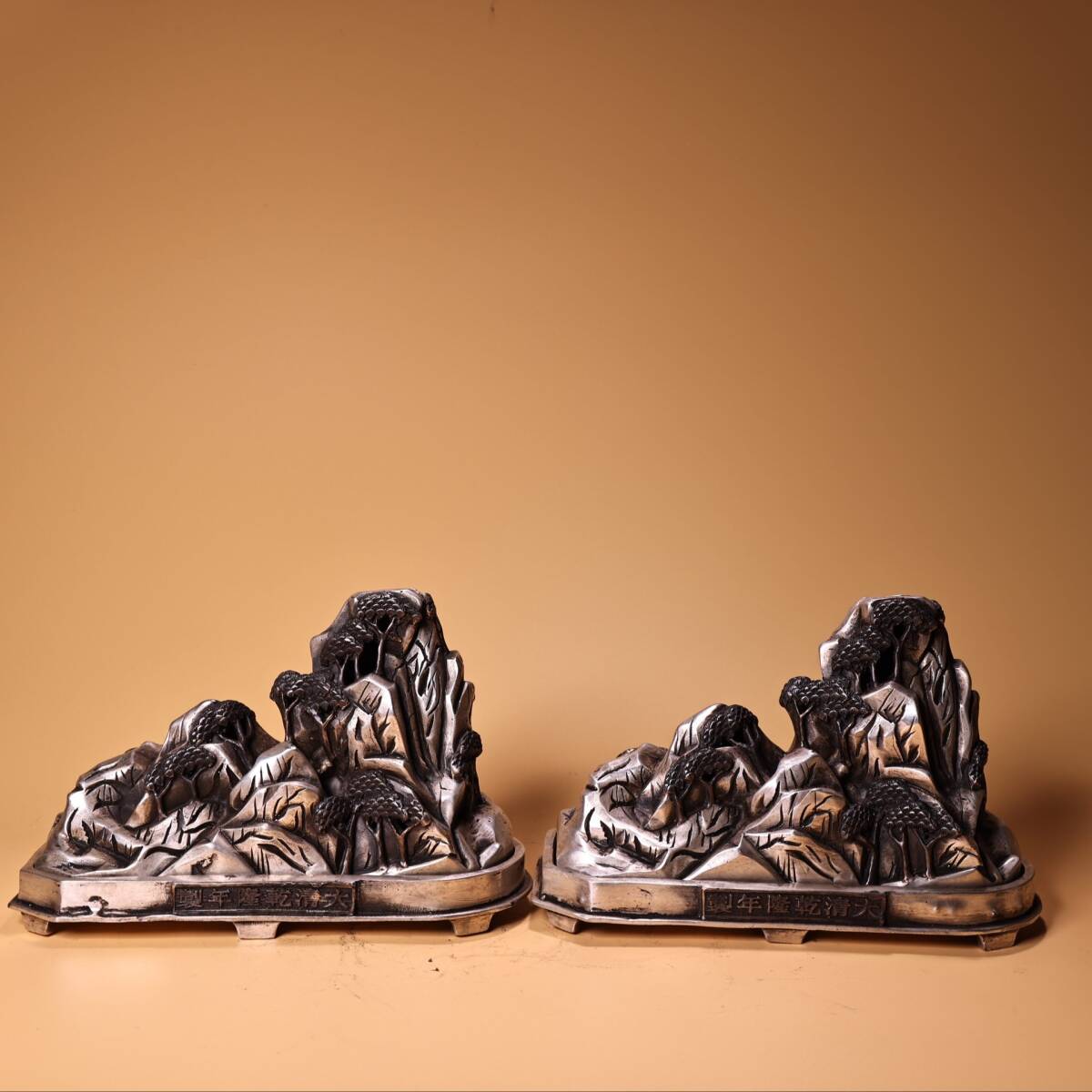 - ▽鴻▽ 銅製 銀鍍 假山筆架熏香炉一對 置物 賞物 古賞物 古董品 時代物 稀少珍品 中国古玩 中国古美術