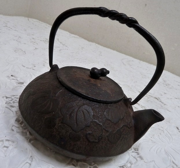 - (☆BM)南部鉄器 鉄瓶 鉄製 茶瓶 瓢箪 ひょうたん柄 宝星堂/宮古堂 煎茶道具 急須 文捻提手平丸鉄瓶 茶器 鉄器 茶道具