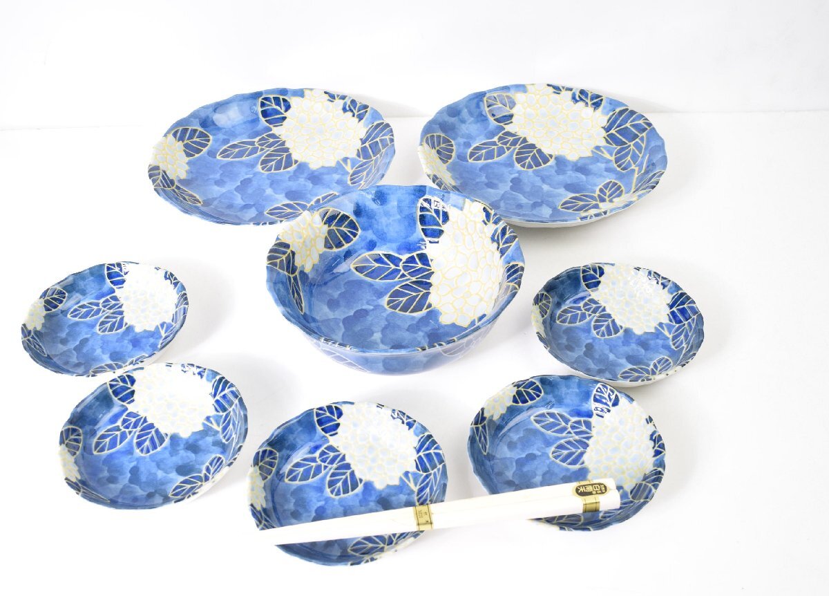 - 0036-MM00315★美濃焼 西洞窯★紫陽花8点セット 深鉢1客 中皿2枚 小皿5枚 天然木のお箸付き(白南天) 陶器 和食器お揃い あじさい 美品