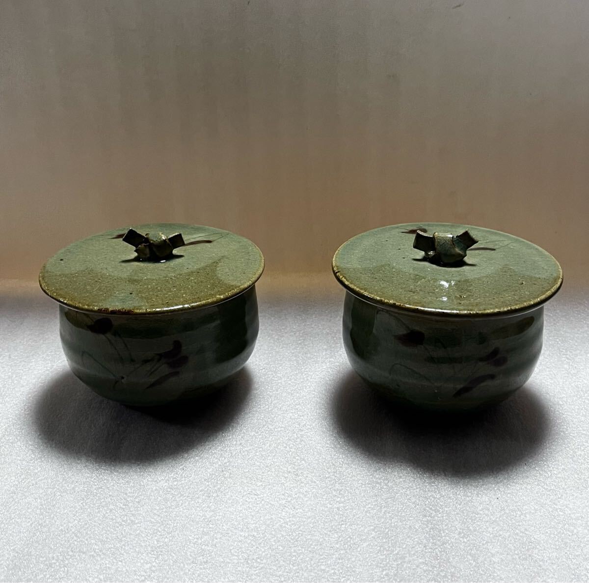 - 未使用 新品 美濃焼 草花文 貫入 蓋付き 2客 銘有り 緑 料亭 懐石 作家物 和食器 お洒落 裏印 グリーン