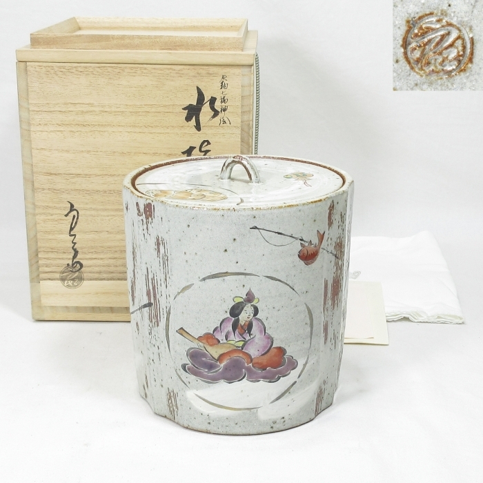 - 【A2071】茶道具 京焼 清水焼 人気作家『 中村 良二 』作 灰釉七福神図 水指 無傷 良作 四方桟 共箱 栞 共布