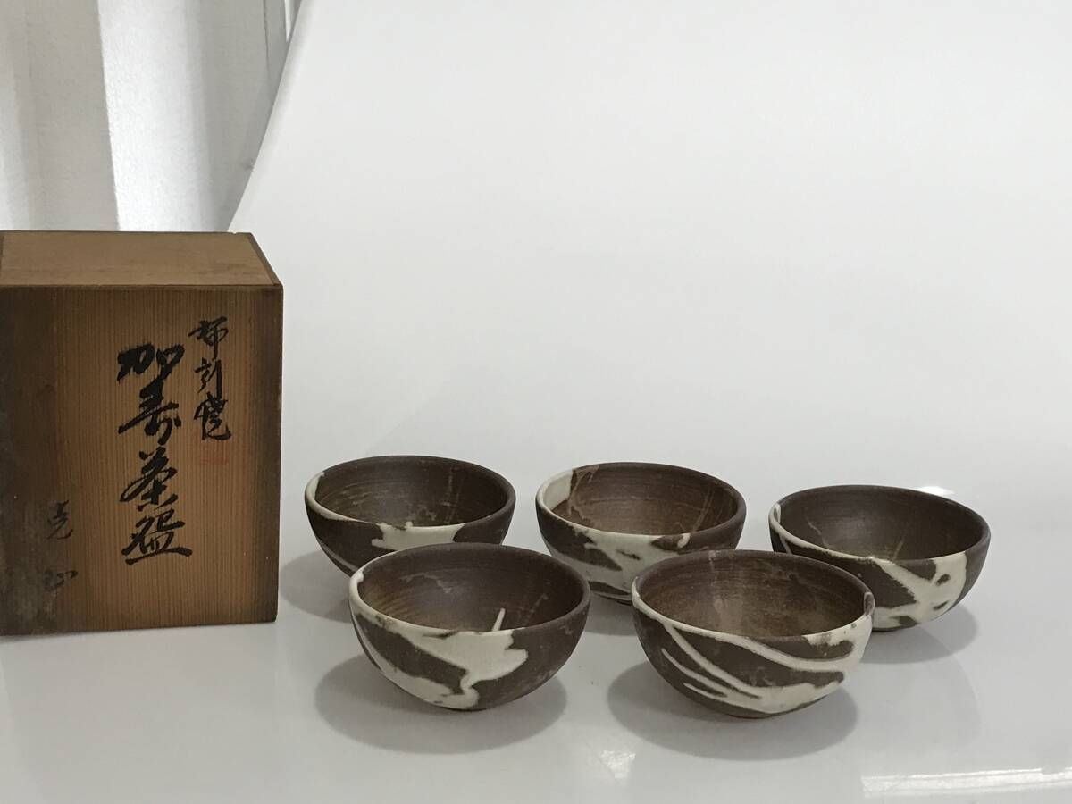 - DG8405 加寿茶碗 5客揃 刻印あり サイズ:高さ約7㎝ 口径約12.7cm 陶器 和食器 共箱