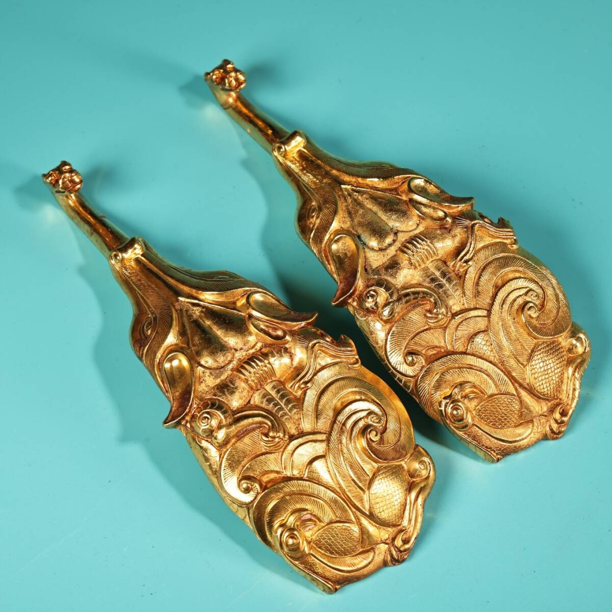 - ▽鴻▽ 銅製 塗金 龍頭如意帶鈎一對 置物 賞物 古賞物 古董品 時代物 稀少珍品 中国古玩 中国古美術
