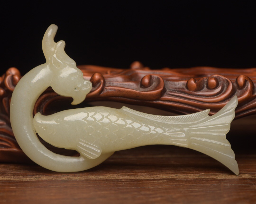 - ▽鴻▽ 和田玉製 細密彫 魚化龍 置物 賞物 古賞物 古董品 時代物 稀少珍品 中国古玩 中国古美術