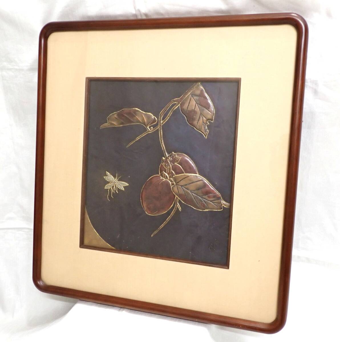 - 銅板絵 日本工芸 刻印 鍛金 銅板 鉄 金属 和骨董 柿 蜂モチーフ槌目 日本 レトロ 骨董 ヴィンテージ 作家 職人 工芸品 レトロ 和室 和物