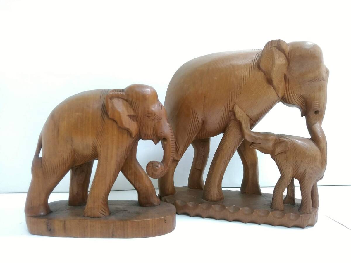 - 木彫り象 置物 2点セット/ゾウ/親子象/木製/オブジェ/アジアン雑貨/エスニック雑貨/インテリア小物/インテリア雑貨/飾り物/縁起物/10-RHB11
