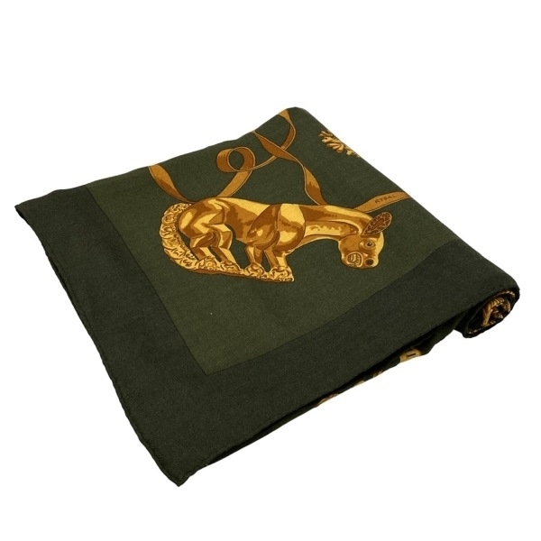 > エルメス HERMES ストール(ショール) カレ140 カシミヤ、シルク カーキ×ブラウン LES CAVALIERS D’OR(黄金の騎士) マフラー