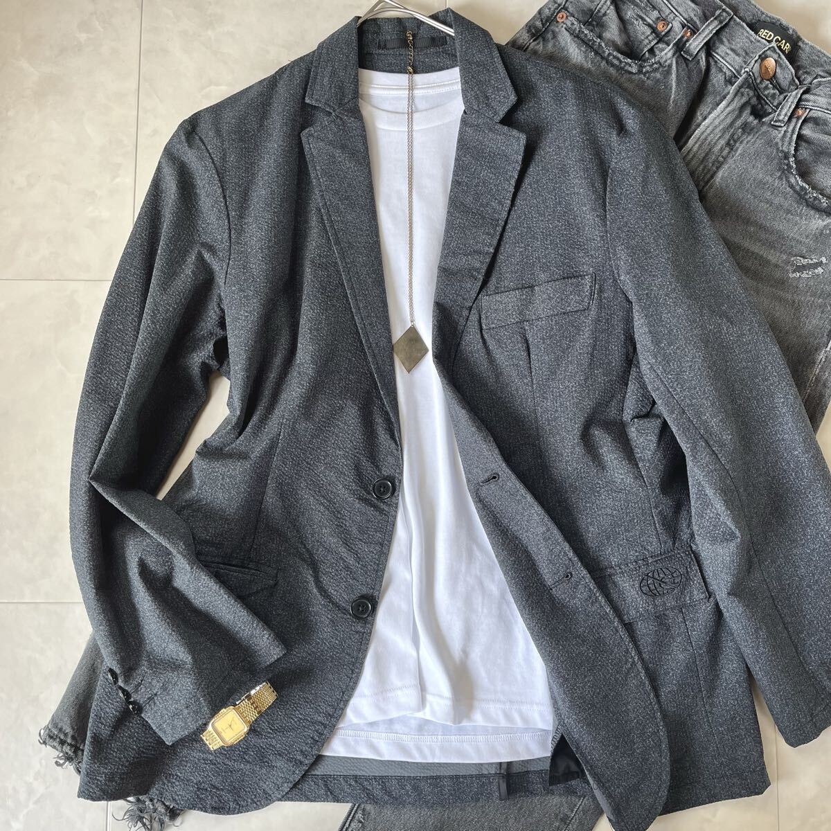 > 美品 L〜XLサイズ相当TRANSCONTINENTS トランスコンチネンツ テーラードジャケット サッカー生地 通気性◎ 黒×グレー シンプル 伸縮性