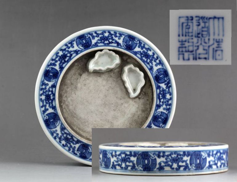 - ●唐物 大清道光年製款 青花硯 磁硯 花卉紋 筆洗 書道具陶磁器 骨董品●