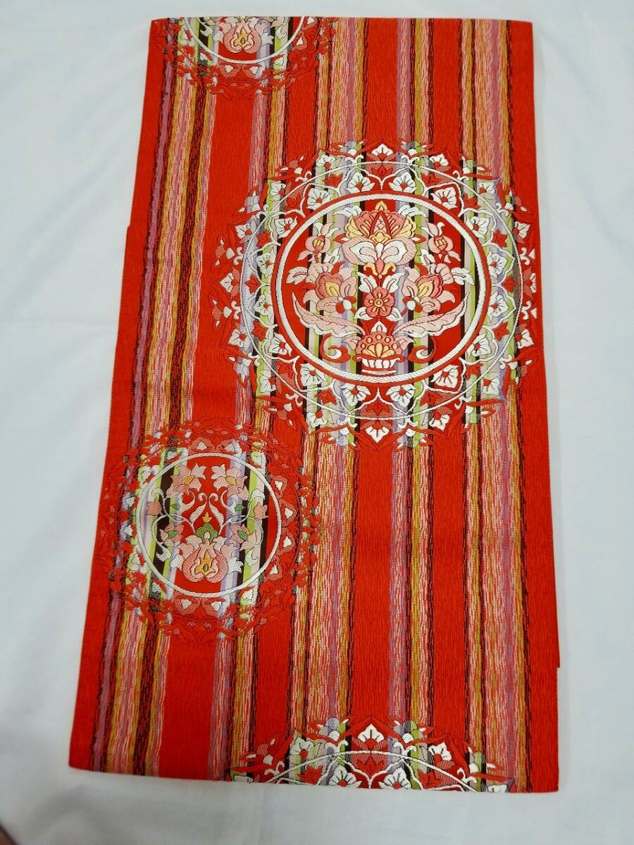 - 【桐輪】八寸帯☆送料無料*本場筑前博多帯*縦縞と花丸文{正絹*本場筑前博多*八寸名古屋帯}*濃い黄赤色地*縦縞と花丸文*六通柄*№4455