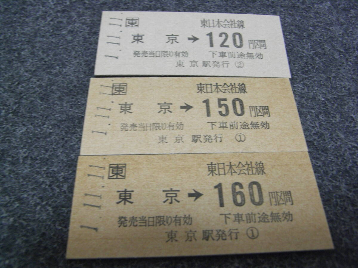 - 1並び日付 国鉄硬券乗車券 3枚/東京→東日本会社線120円区間・150円区間・160円区間 平成1年11月11日 東京駅発行 3枚●JR東日本