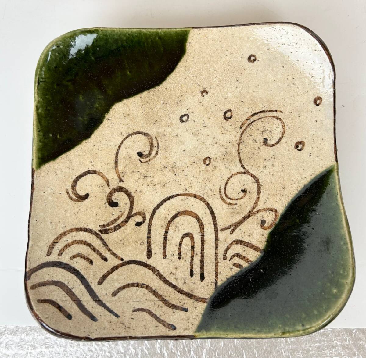 - ☆★☆織部焼 四方皿 三脚 茂作 陶印 山口茂作 角皿 和食器 懐石料理 茶道具 茶会 菓子器 菓子皿 皿 美術品 ☆★☆