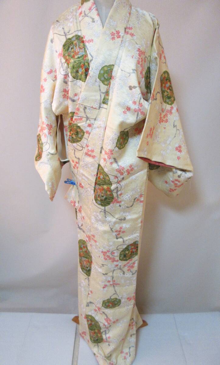 - 53-4.着物 クリームイエローベージュ系 花 身丈約152.5㎝