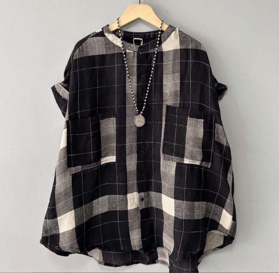 - 人気推薦/レディース チュニック チェック柄 ブラウス トップス 綿麻 シャツ 半袖 体型カバー コットンリネン ゆったり