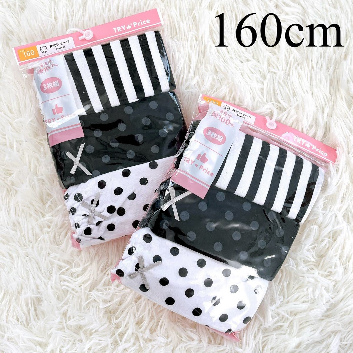 - 下着/パンツ/ショーツ/女の子/3枚/セット/3枚組/ドット/水玉/ボーダー/TRY Price/綿100%/コットン/女の子/子供/新品/白/黒/160/セット/6枚