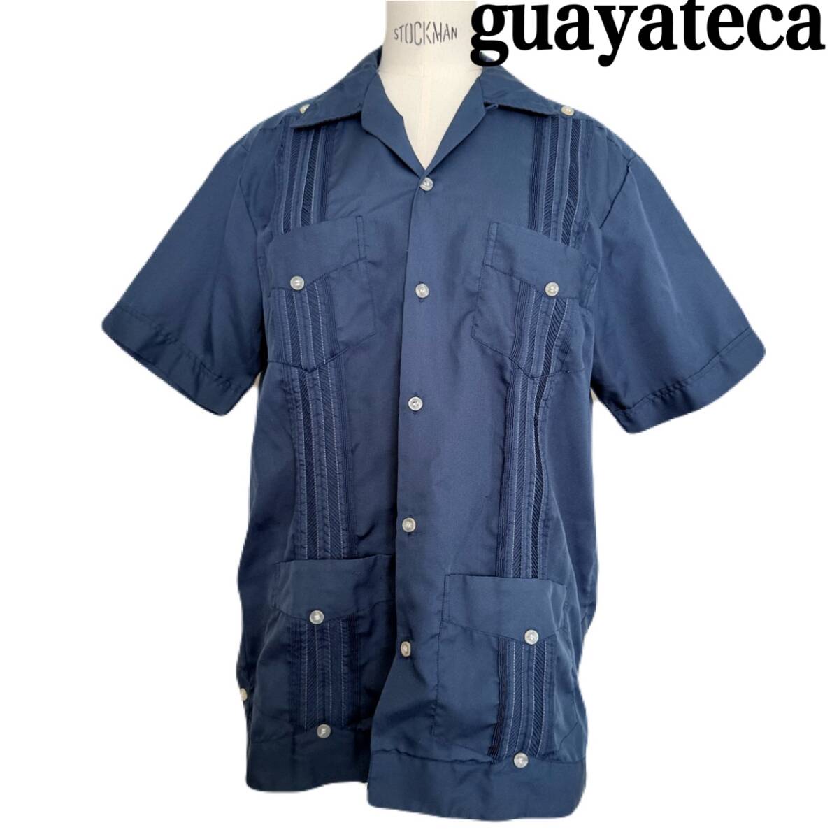 > ★ 70‘s 80‘s ヴィンテージ古着 guayateca キューバシャツ タックプリーツ 装飾 濃紺 ネイビー メキシコ製 半袖 シャツ M 38 ★
