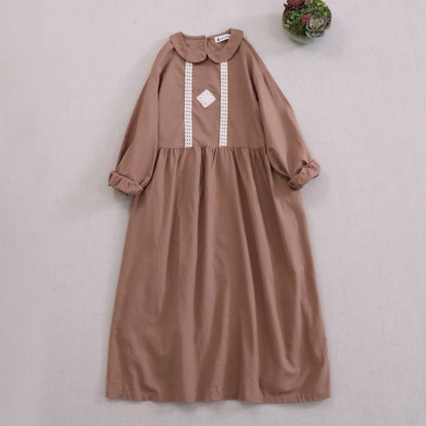 - lb 0708 ワンピース Aライン フリーサイズ チュニック トップス ナチュラル 綿麻混 大人可愛 丸い襟 レース キャラメル系