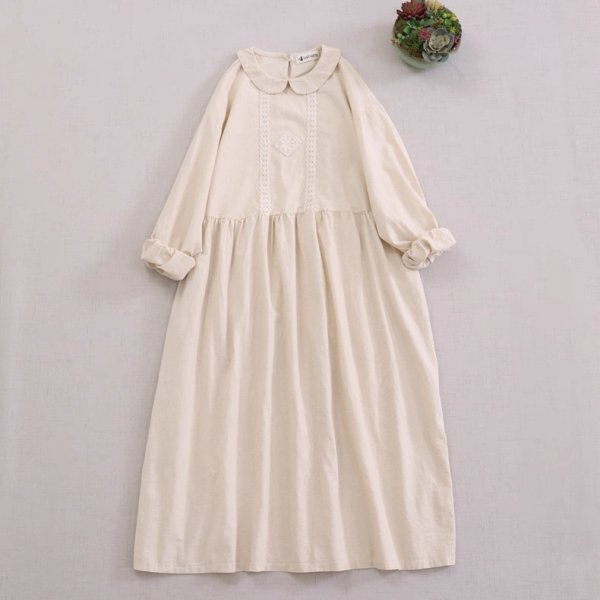 - lb 0708 ワンピース Aライン フリーサイズ チュニック トップス ナチュラル 綿麻混 大人可愛 丸い襟 レース ベージュ系