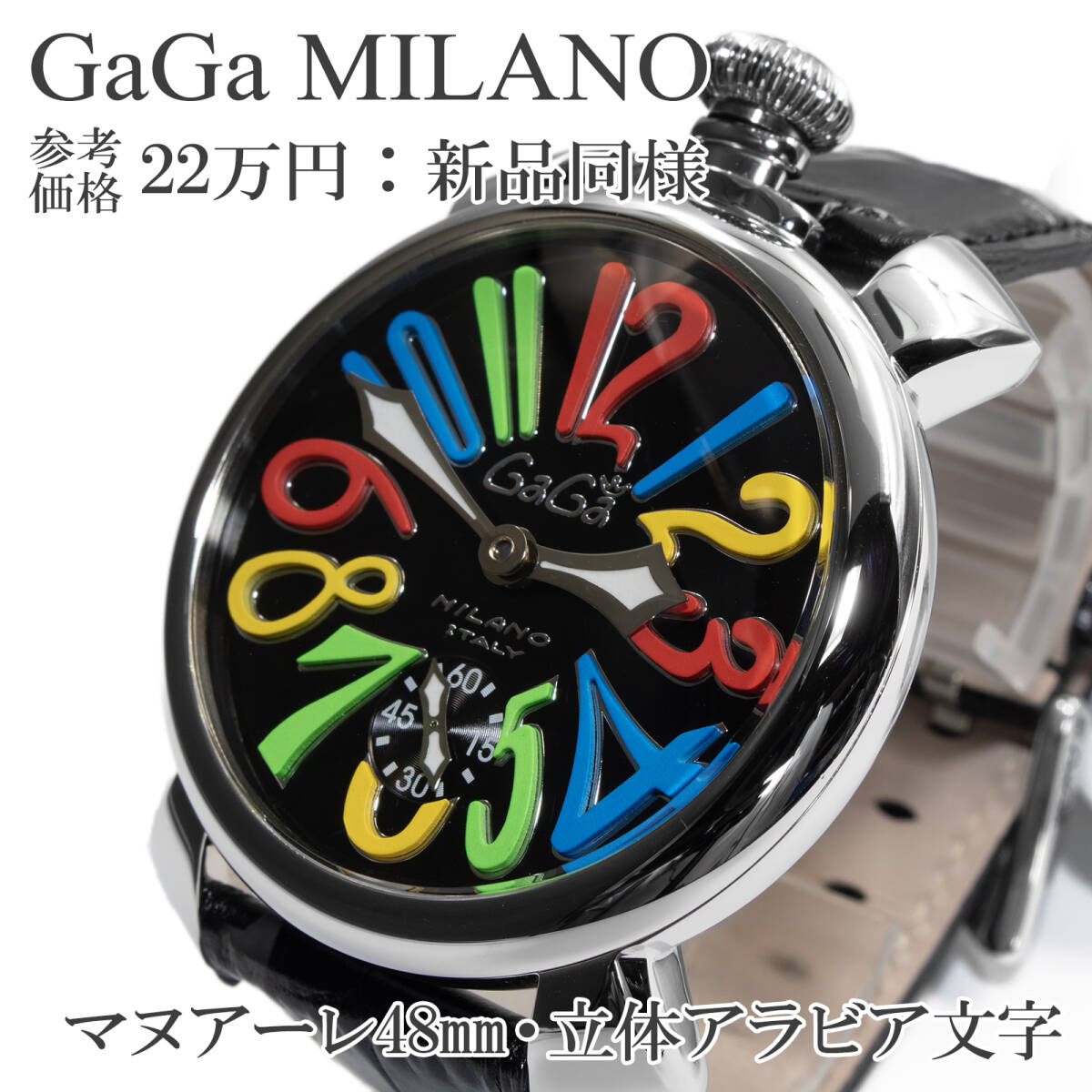 > 送料無料 ガガミラノ 腕時計 手巻き 新品同様 メンズ マヌアーレ48mm 5010.02S 黒 派手 目立つ 大型 裏スケ カラフル ロゴ 革ベルト Q130