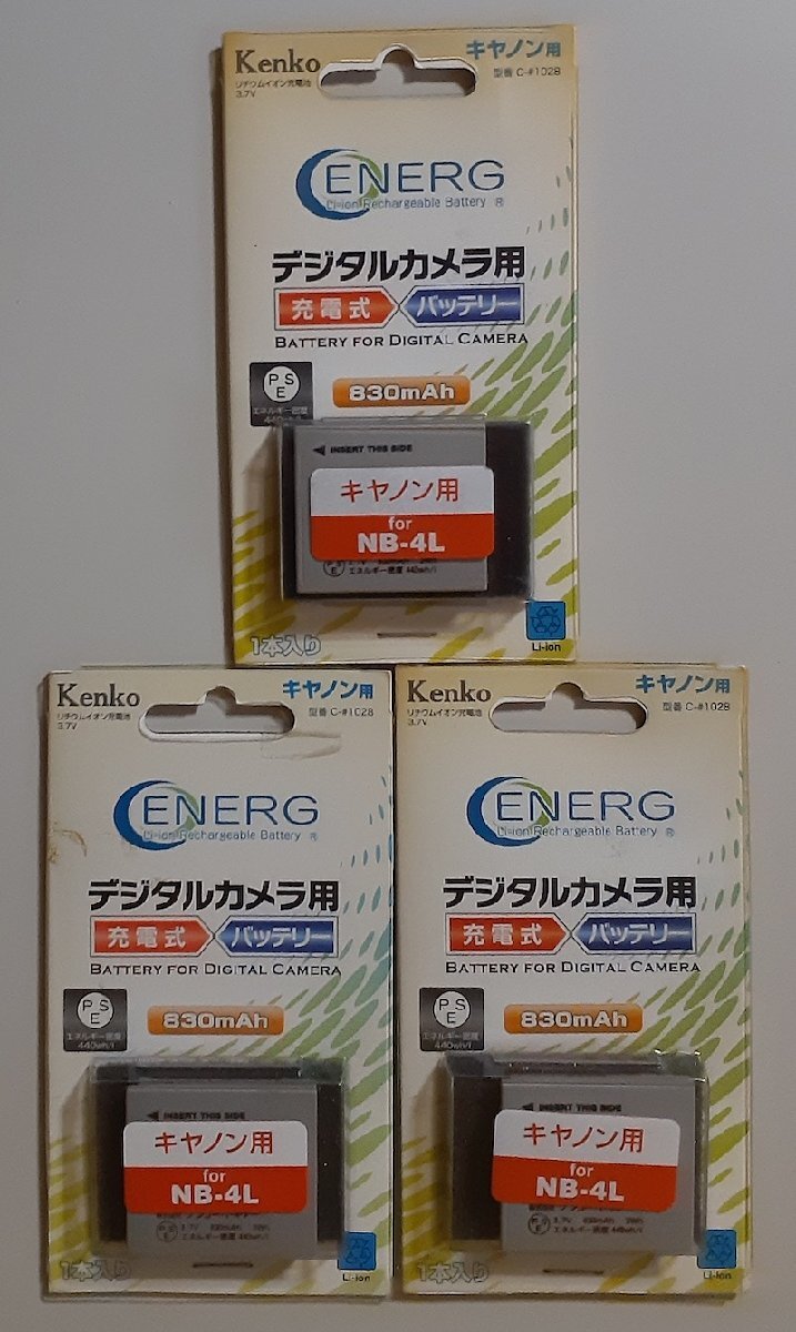 - 6438 未使用未開封 3個 互換バッテリー キャノン NB-4L互換 kenko ENERG リチウムイオン充電池 3.7V 830mAh C-#1028 ケンコー・トキナー